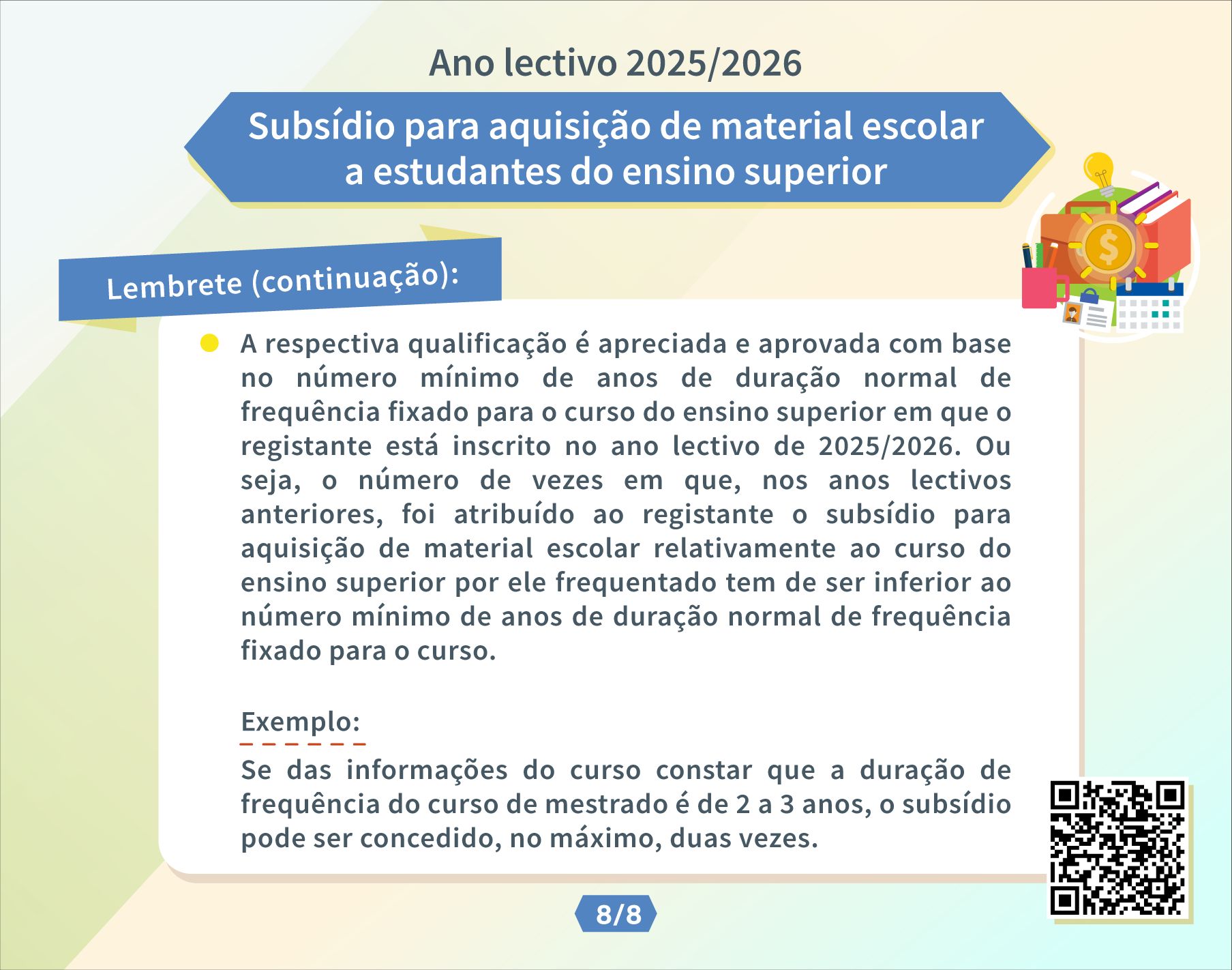 To express the concern and care of the Macao SAR Government on tertiary education students,the "Learning Material Subsidy for Tertiary Education Students" will be launched again for the academic year 2025/2026 in supporting the students to purchase books, reference and learning materials. The subsidy will be granted to Macao resident ID card holders who are undertaking academic degree courses, or tertiary education courses with a learning period of not less than two academic years. The courses should be organized by a public or private tertiary learning institution recognized by the Macao SAR or by the authorities of the countries or regions concerned. Moreover, the courses must start in the period between April 2025 and March 2026 and with a duration of six to twelve months as stipulated by the relevant institutions. To obtain the subsidy which amounts to $3,300 patacas, the students should complete the registration formalities by 29th May, 2026 (system will be closed at 23:59:59 Macao time on the aforesaid deadline).